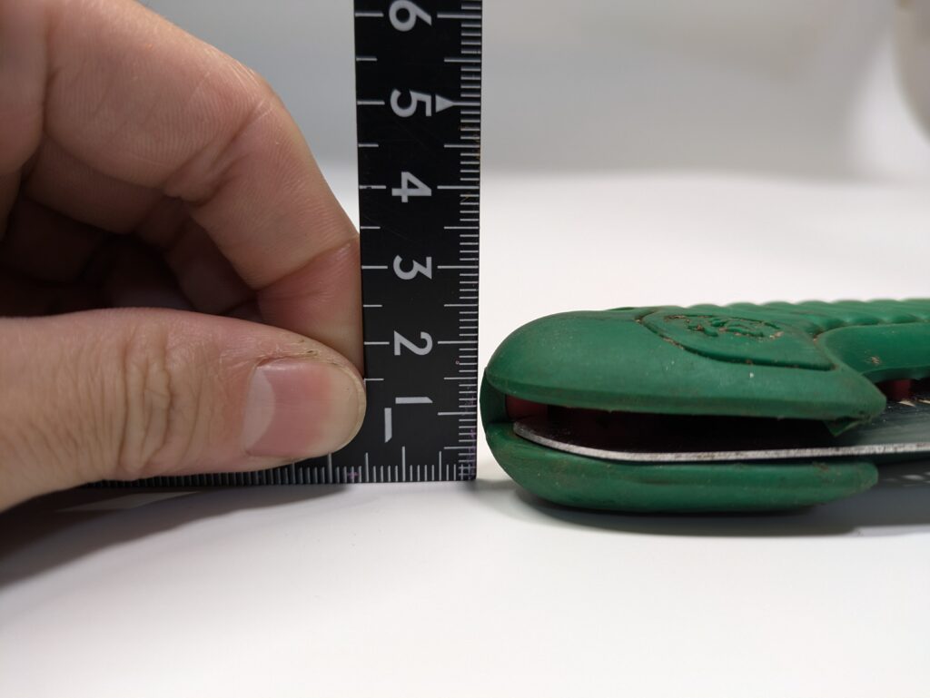 アルパインカスタムのグリップは厚さ10㎜ / 重量25gです。これはよくある市販のノコギリの半分以下の厚さなので、パッキング後でも隙間にスッと差し込むことができます。