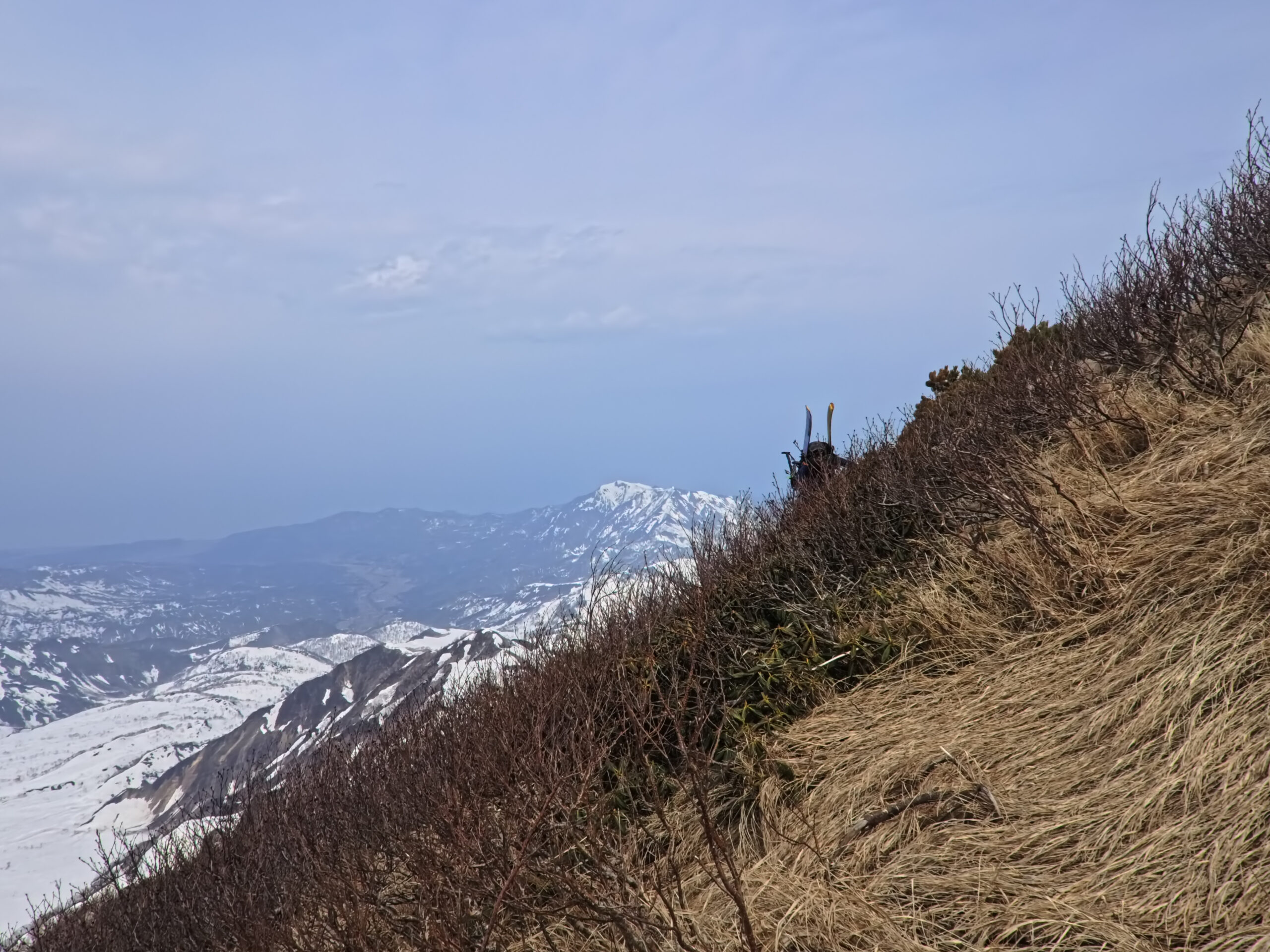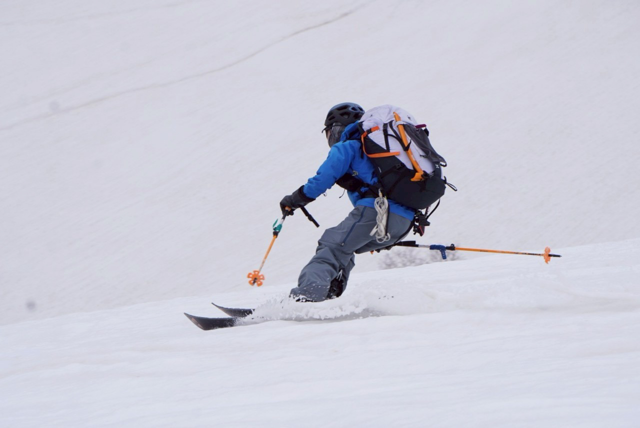 雨予報が早まったことと、予定していたルートでは時間がかかりすぎる可能性があるのとで、火打を登り返して南面の惣兵衛谷を滑ることにした。北面台地から火打北尾根への登り返しが、硬めの急斜面で、めぐさんは大分怖かったようだ。うまくフォローできず申し訳ない。