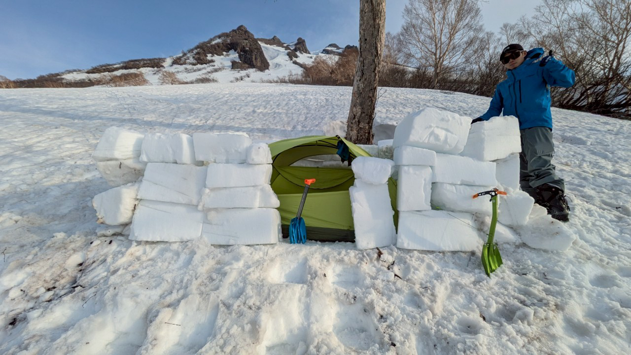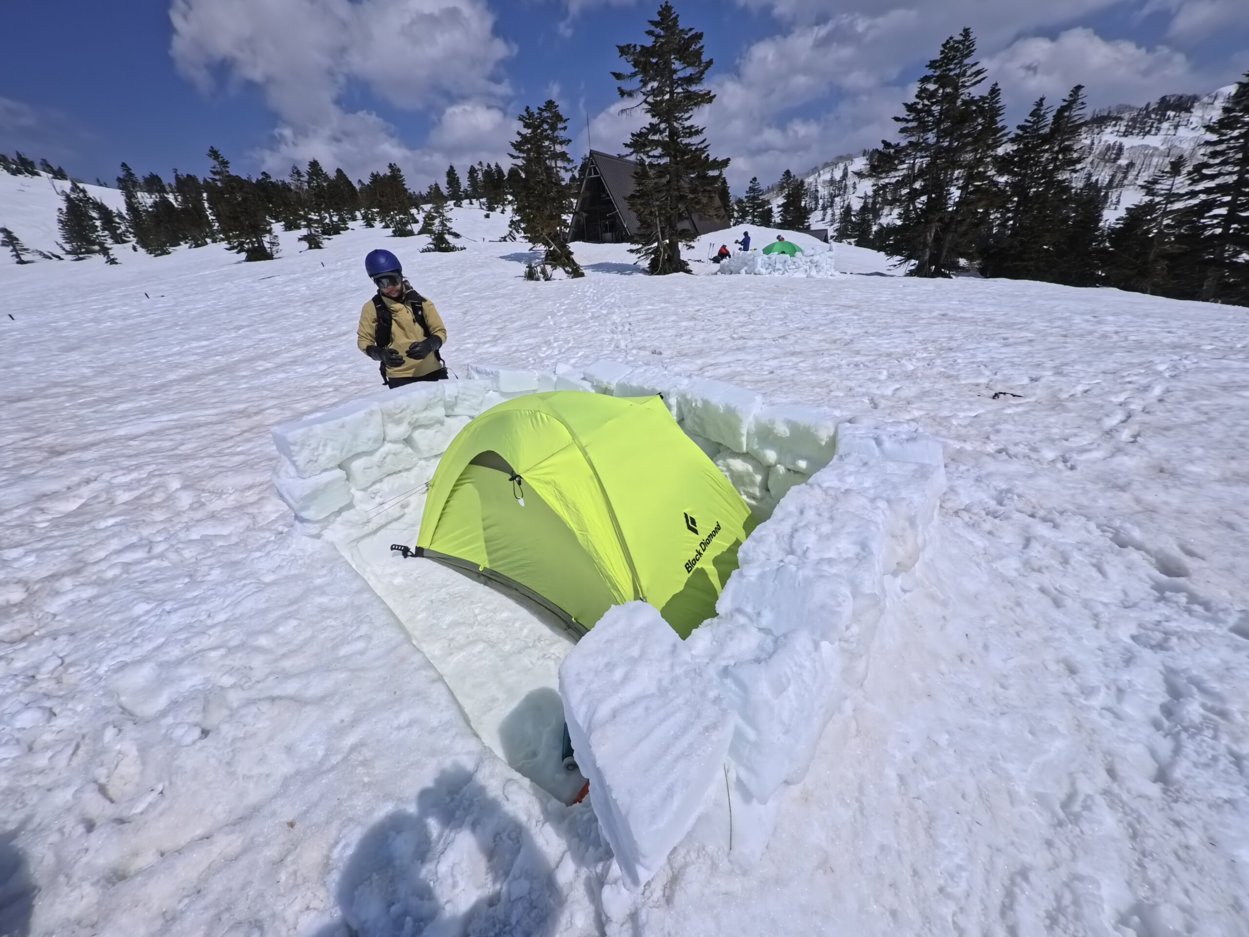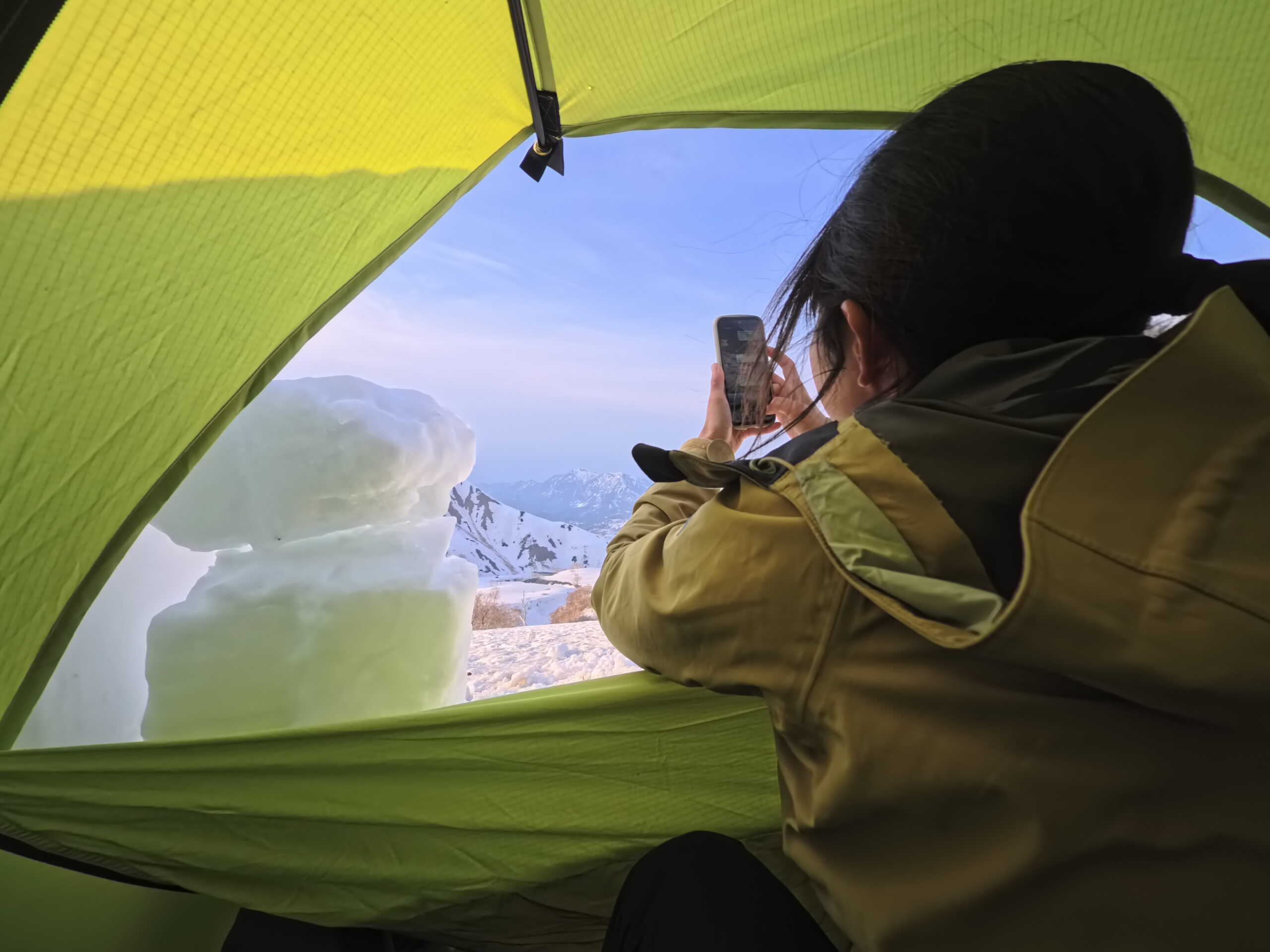 北面台地まで行きたかったが、氷結高度が低くカッチカチなので、友達と合流して高谷池ヒュッテの周辺でまったり過ごす。
