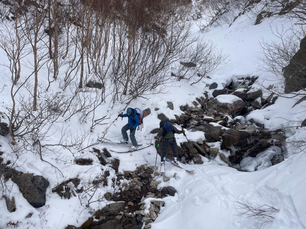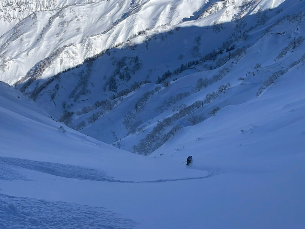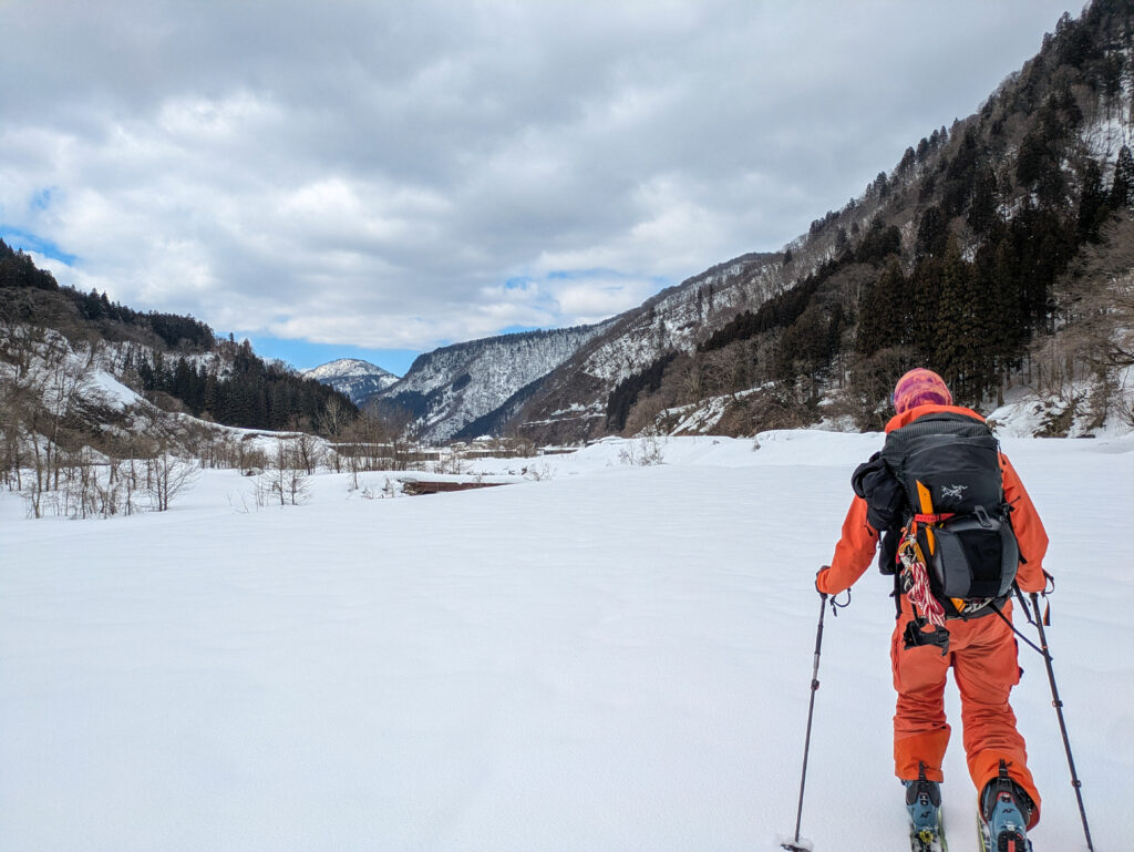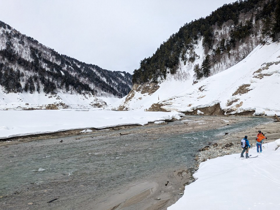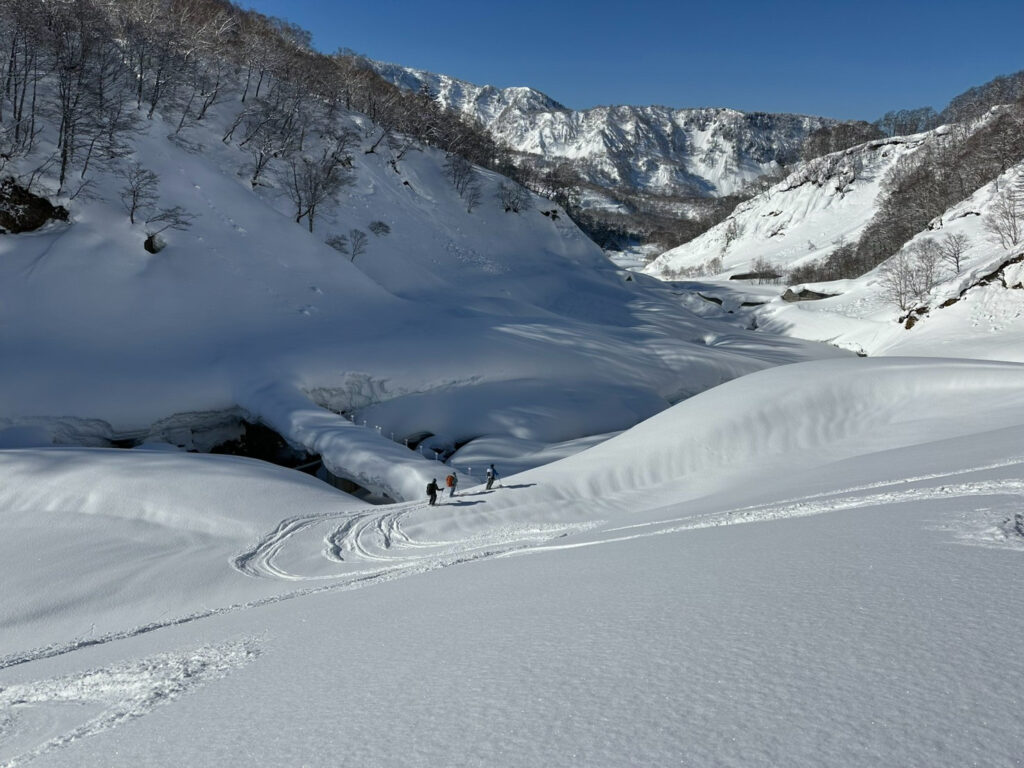 青空の中まだ生きているパウダーを滑走し、常願寺川沿いの林道へ入る。日が高くなり、雪が重くなってくると修行タイムに突入。堰堤沿いをルーファイしながら延々と横移動していく。黒部横断経験者のかなこさんのルーファイに助けられた。