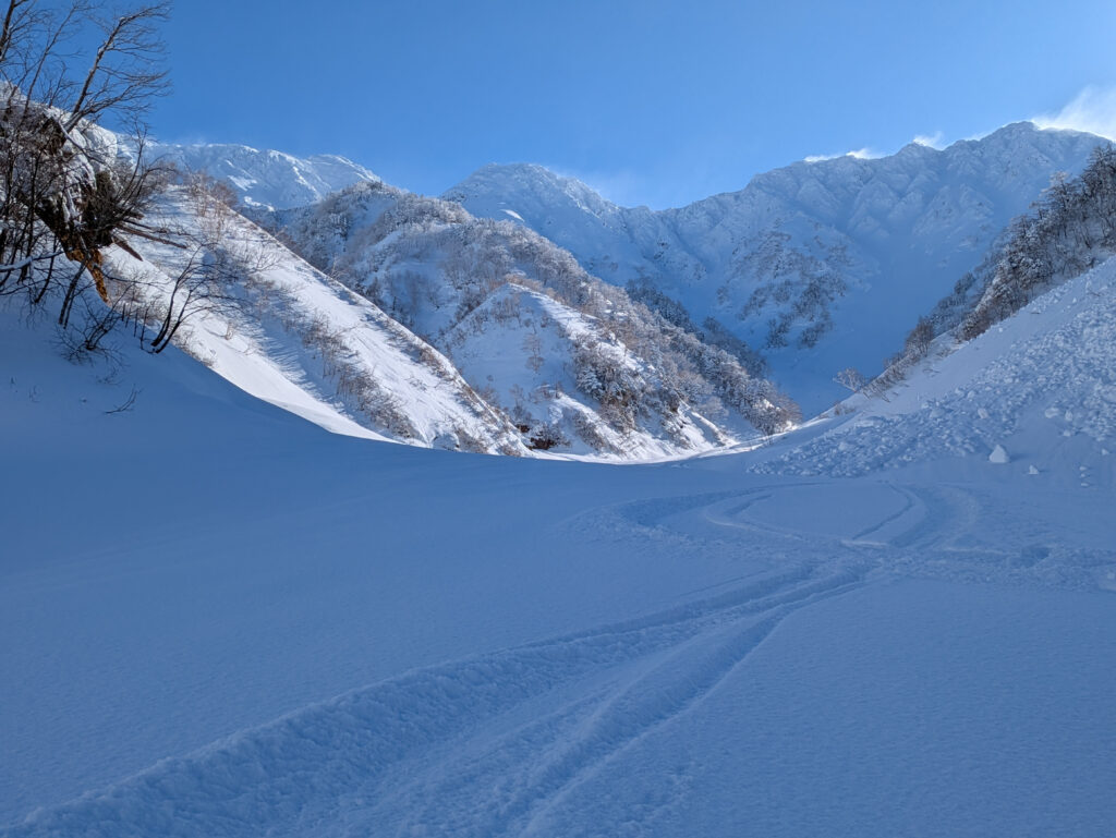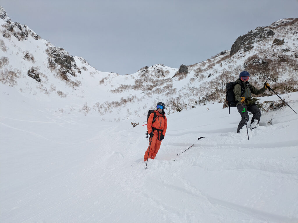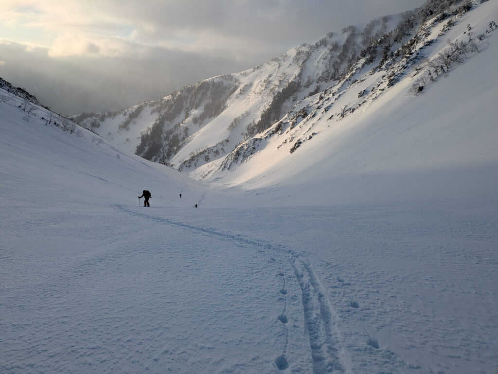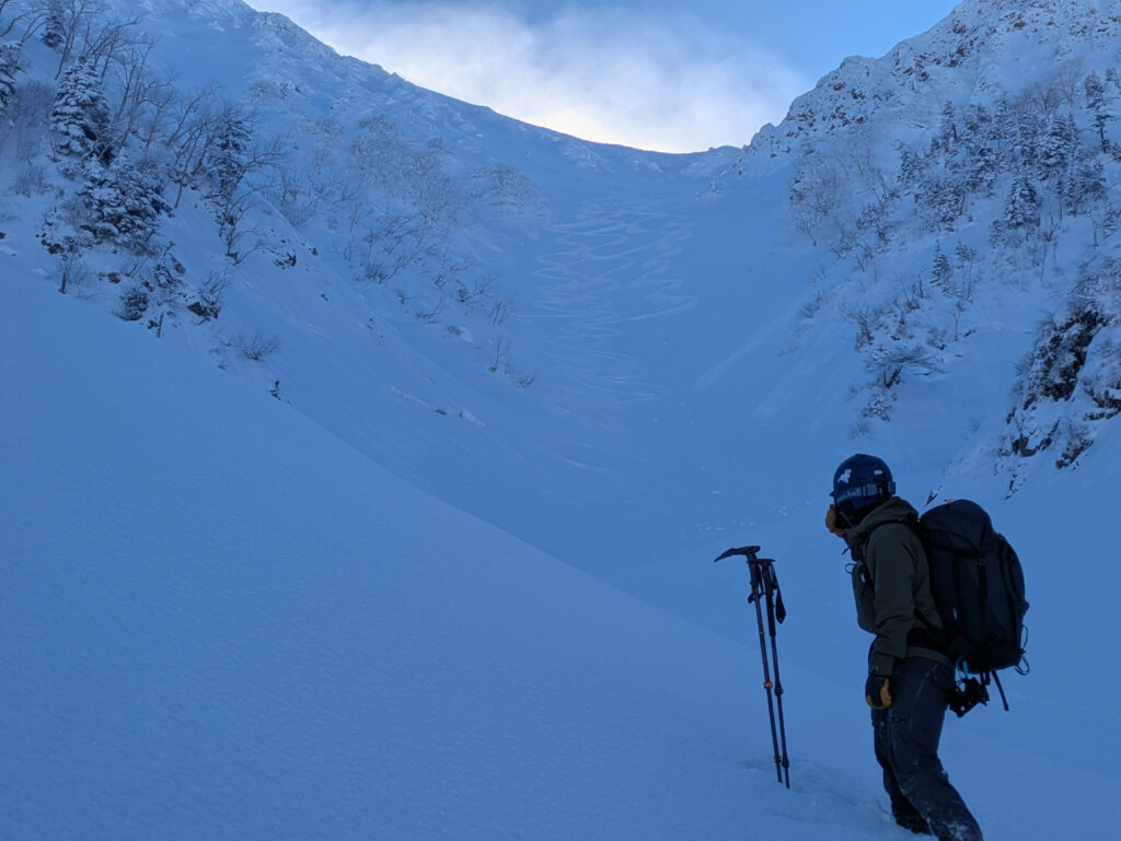前日までにそこそこ降雪があり、旧雪との結合がやや不安だったが、メンバーと相談し、総合的に判断して決行を決めた。自分だけでは、エスケープルートや積雪コンディションの判断にだいぶ悩んだと思うが、経験豊富なメンバーから勉強させていただいた。
