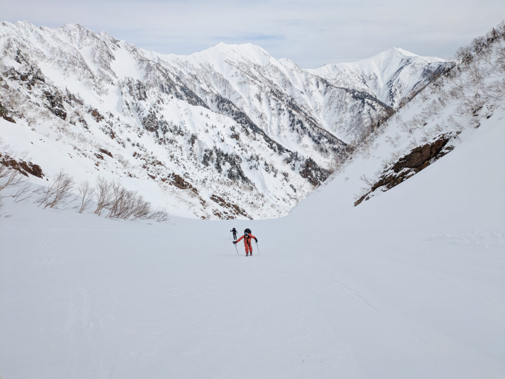 針ノ木峠から針ノ木本谷までは、標高差600mの滑走。泊まり装備を担いでおり、やや引っかかる雪質なので慎重に滑る。パッとしない天気だが、開放的な谷を広く使ってシュプールを描いていく。本谷出合付近は沢が出ており、何度か板を脱いだ。