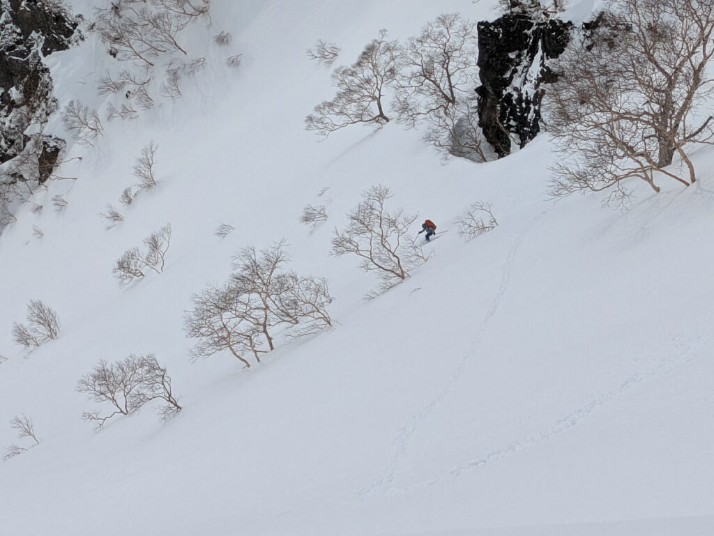 ザラ峠直下のガリガリゴツゴツ区間を、横滑りでやり過ごし、いざドロップ。スネくらいまでの深さの軽いパウダーで、スピードの出る良い斜面。文句なしだった。リグループポイントが少なく、Co1950mあたりまで標高差350mを一気に落とし、しばらく放心した。